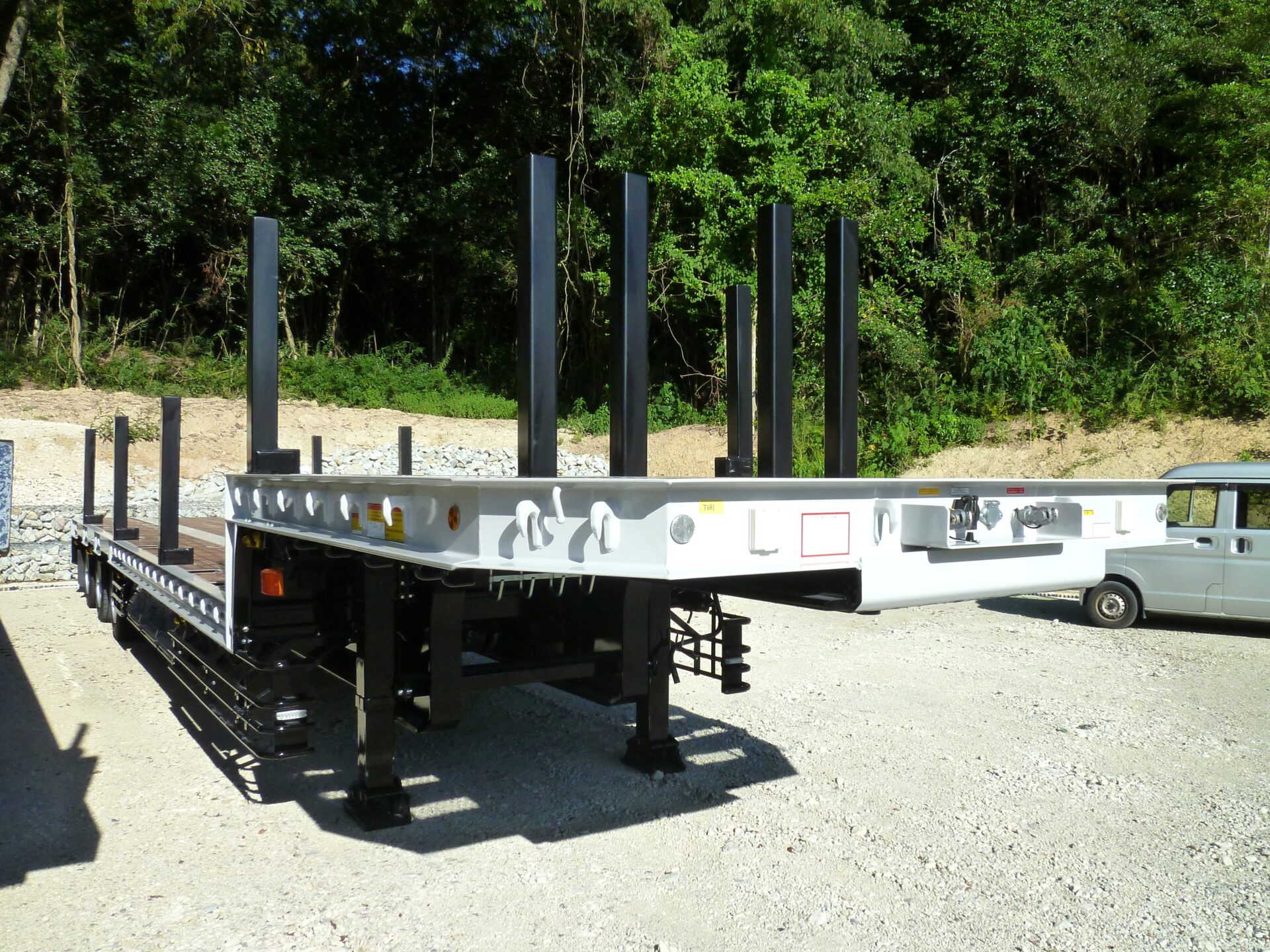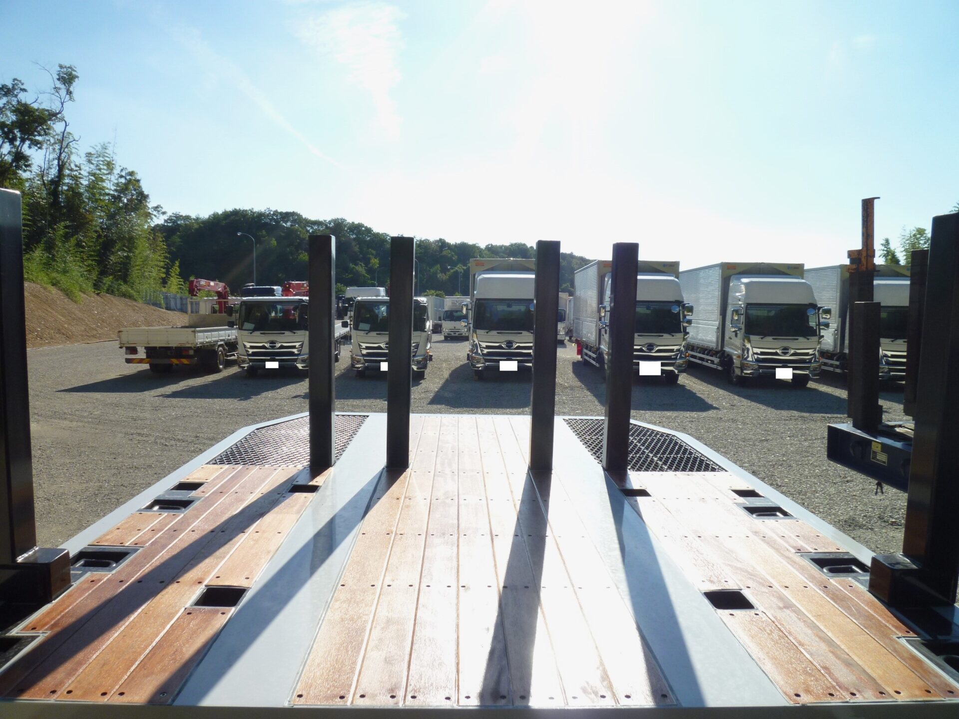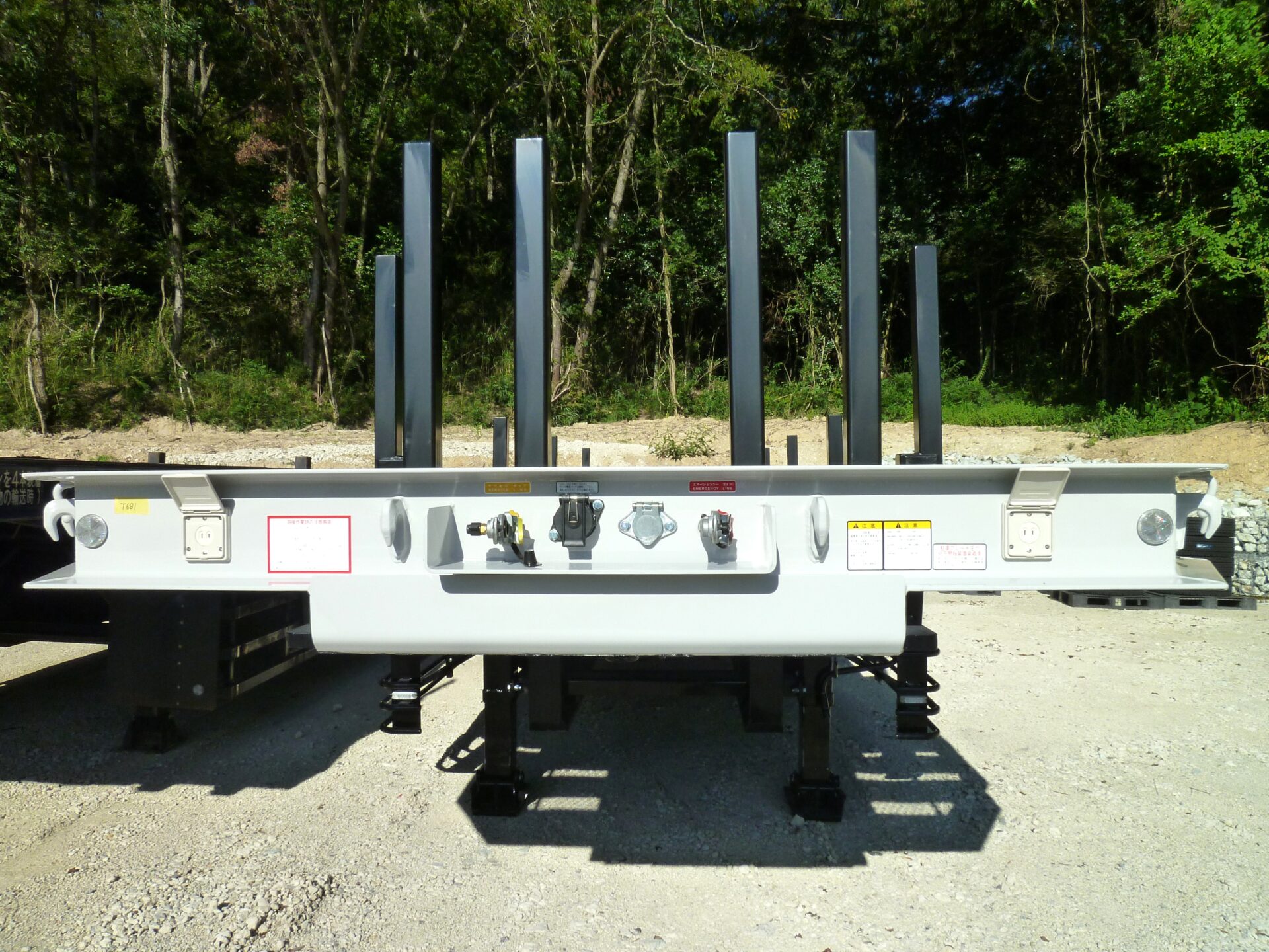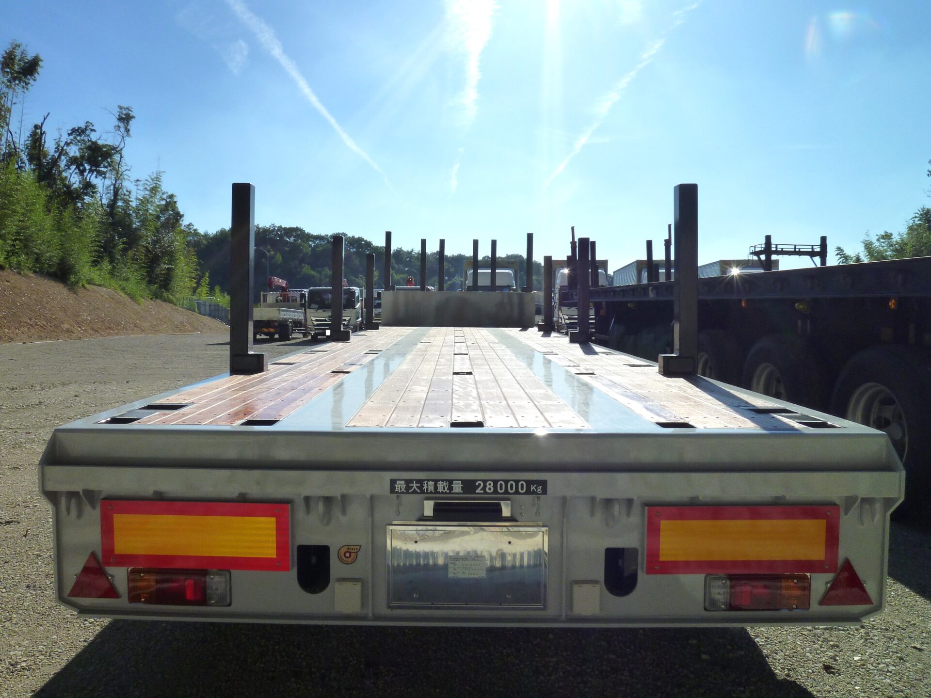 日本トレクス 型式/PLB34114 製造年月/2025-08 床/板張り エアサス 段付き(高さ540mm) リフトアクスル中軸残し 埋込フック 前段/3対 後段/8対 センター/6ヶ所 スタンション穴 前段/6ヶ所 後段/33ヶ所 ロープフック 前段/9ヶ所 後段/37対 前方/2ヶ所 後方/6ヶ所 工具箱×3 物入れカゴ