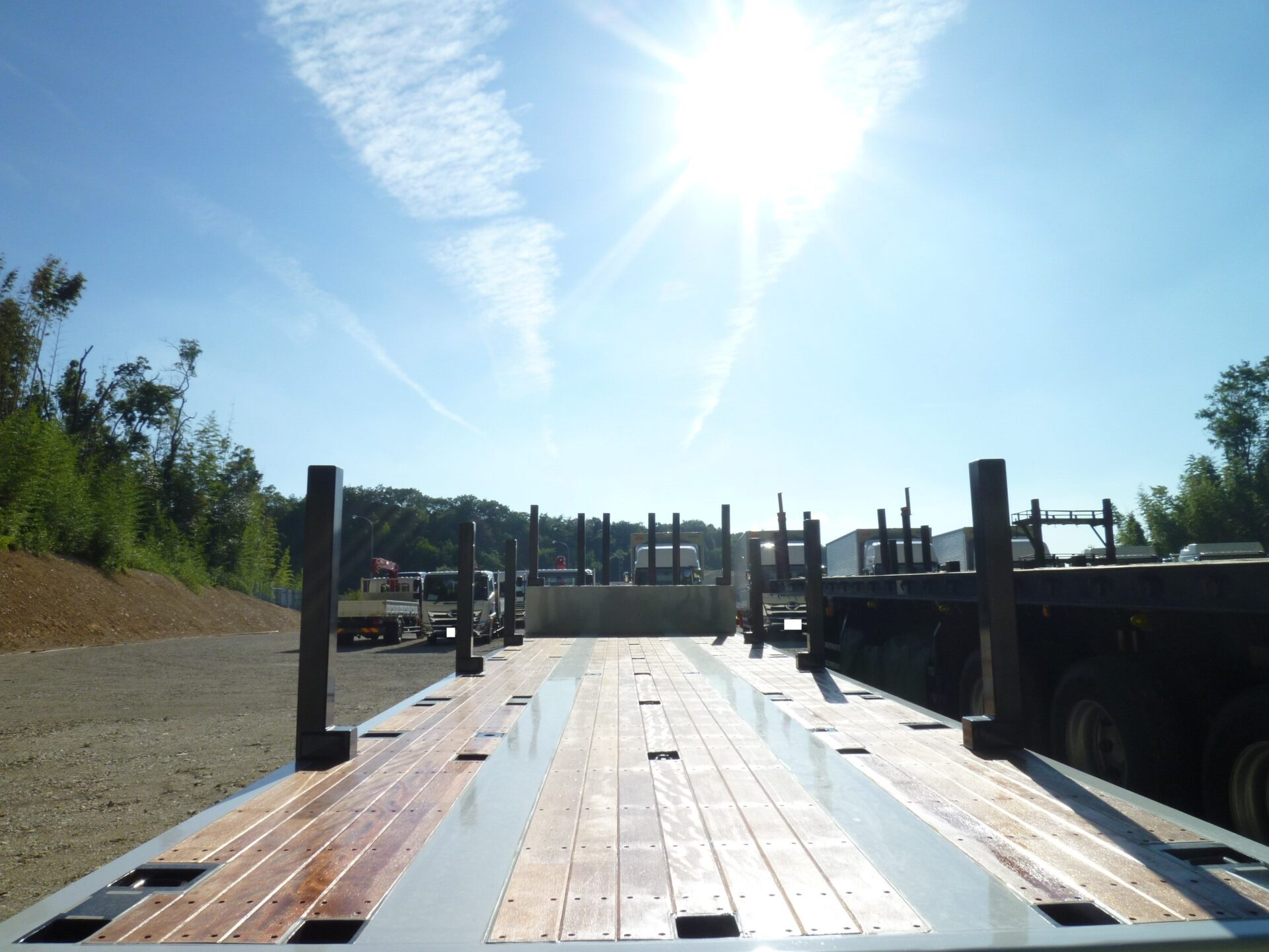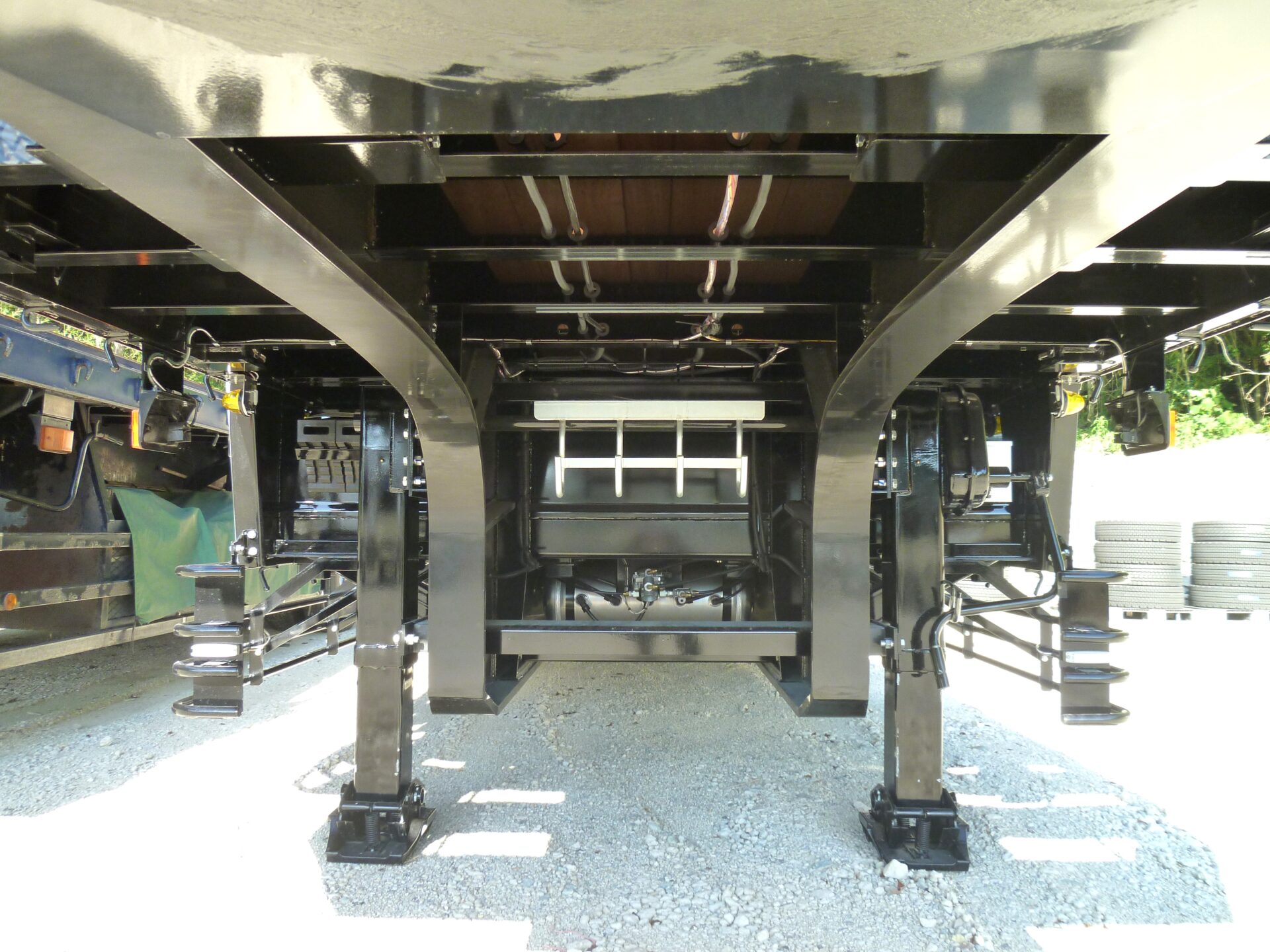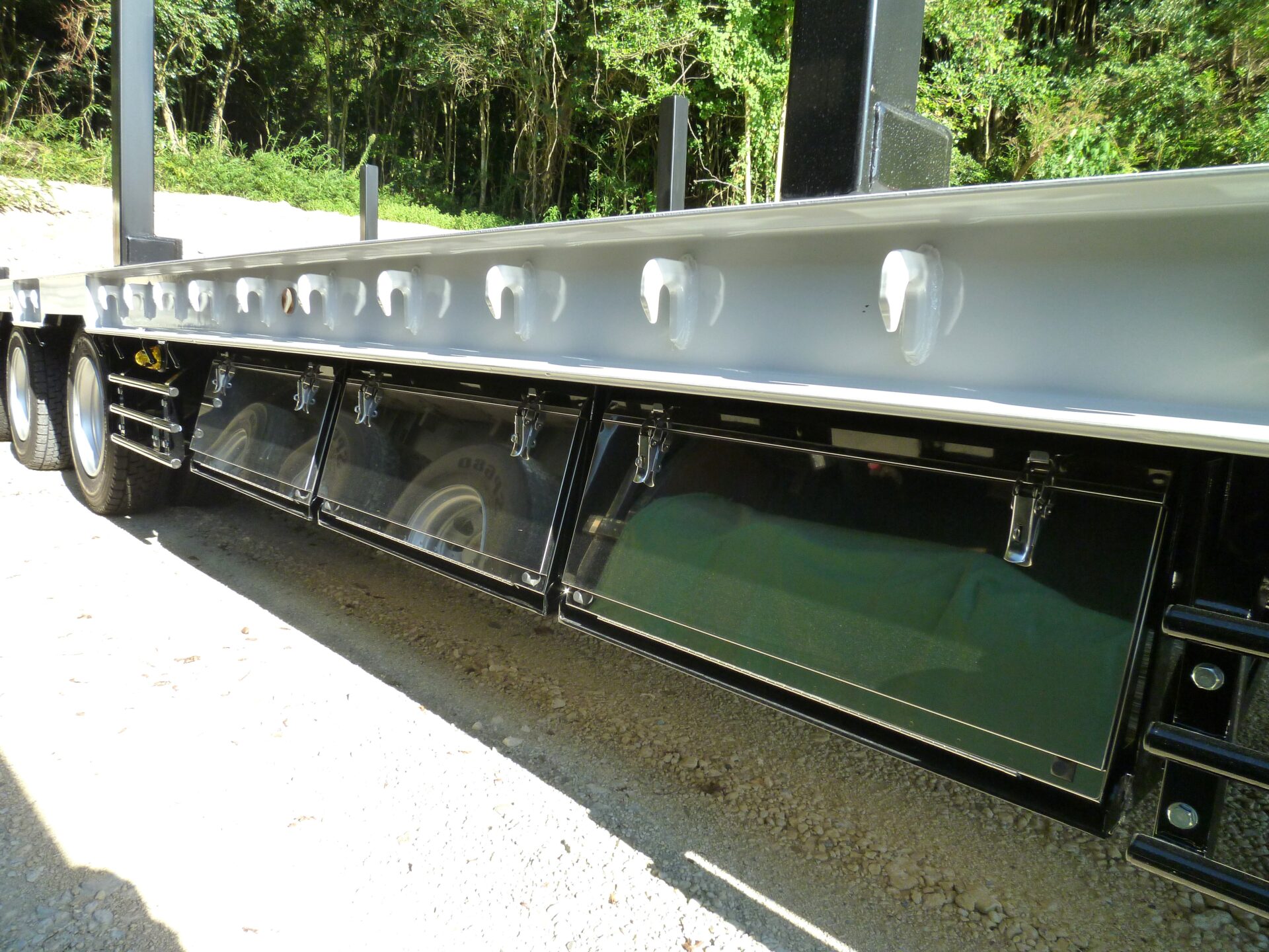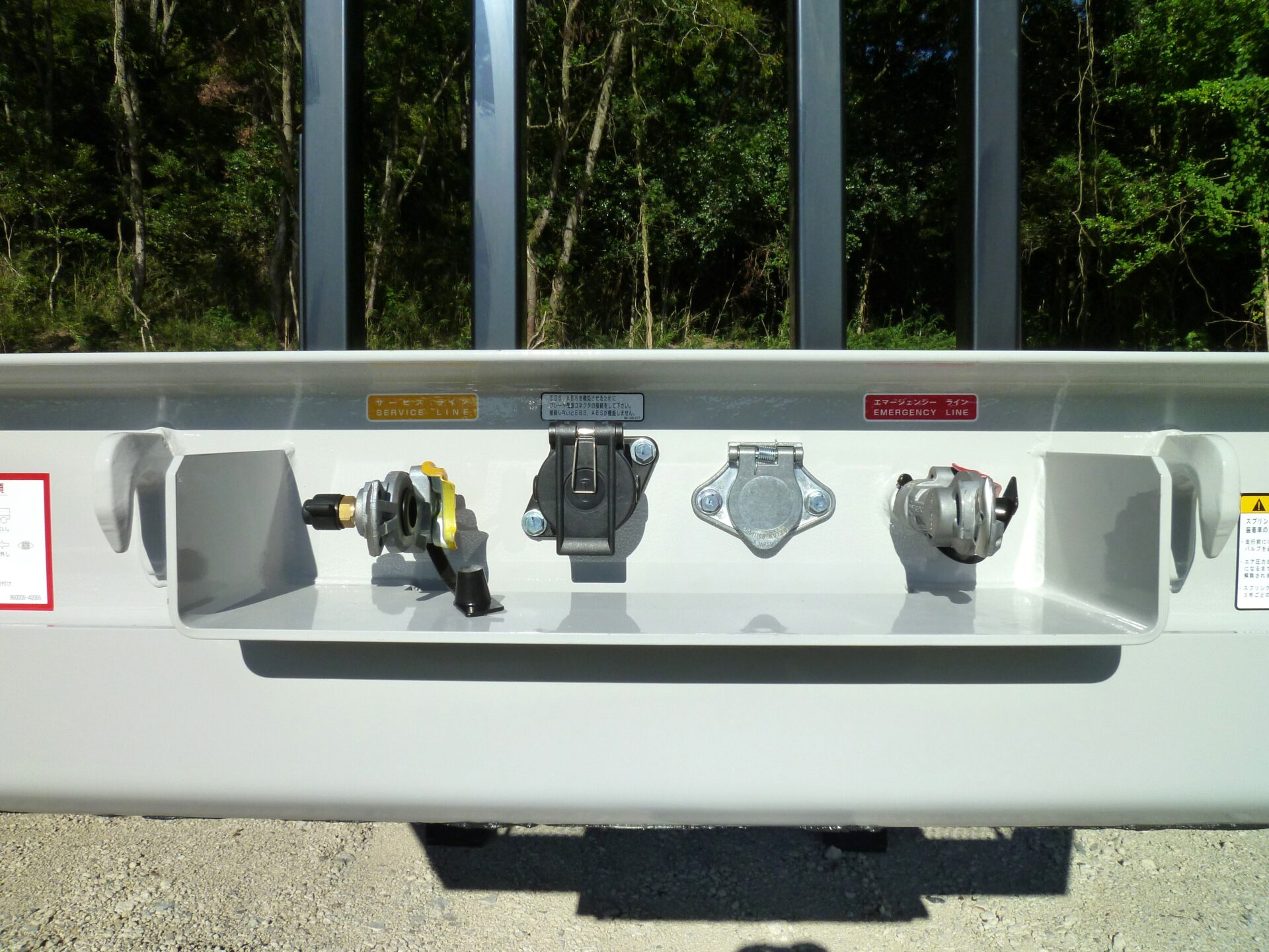 日本トレクス 型式/PLB34114 製造年月/2025-08 床/板張り エアサス 段付き(高さ540mm) リフトアクスル中軸残し 埋込フック 前段/3対 後段/8対 センター/6ヶ所 スタンション穴 前段/6ヶ所 後段/33ヶ所 ロープフック 前段/9ヶ所 後段/37対 前方/2ヶ所 後方/6ヶ所 工具箱×3 物入れカゴ