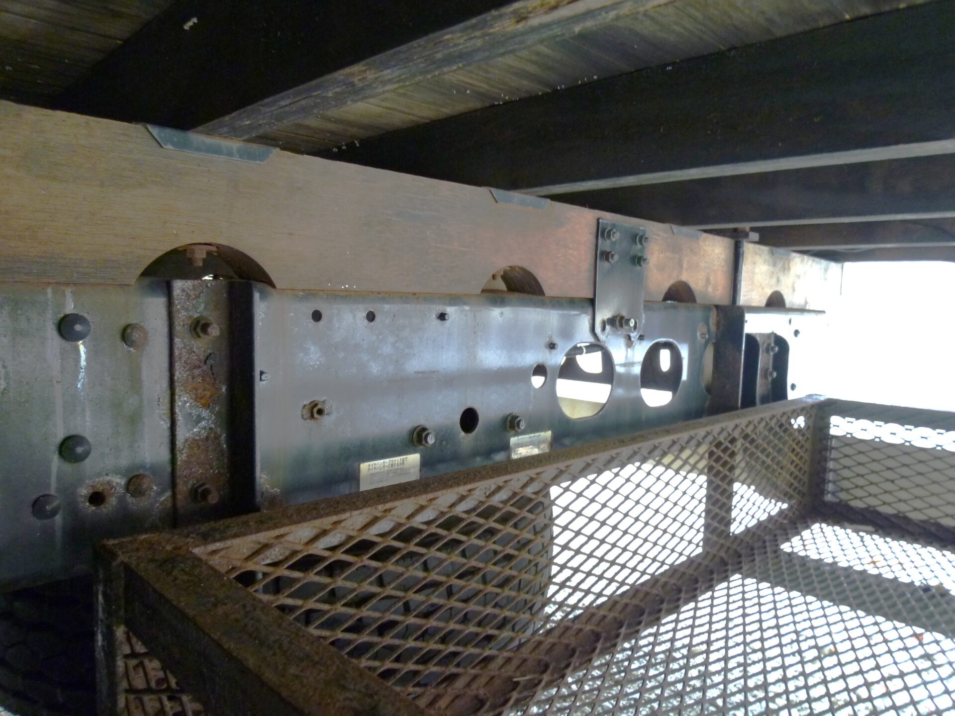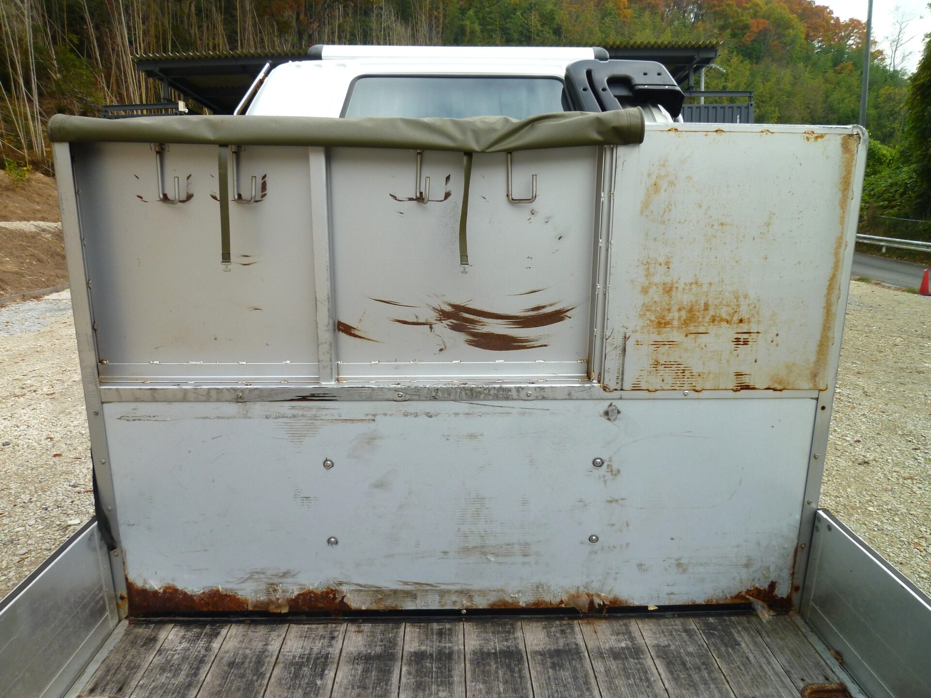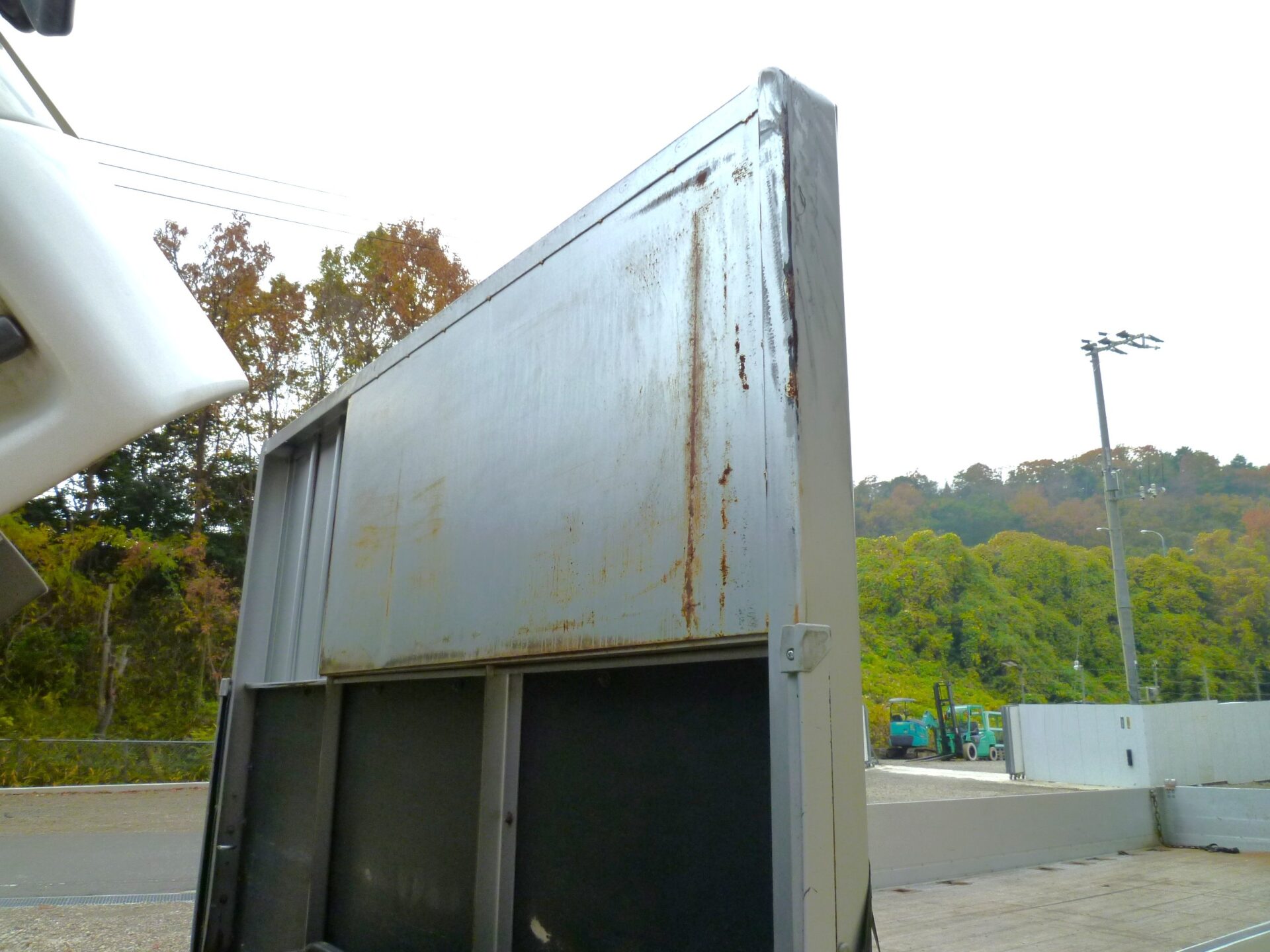 小平産業/A189001321(コーションプレート無) アルミブロック/3方開 シート台 工具箱×1 物入×1 床/板張り 埋込フック/10対 後方1コ スタンション穴/9ヶ所 鳥居部物掛けフック/4コ リアエアサス メッキパーツ 煽り内外/スリキズ・凹み多数・ふくれ小