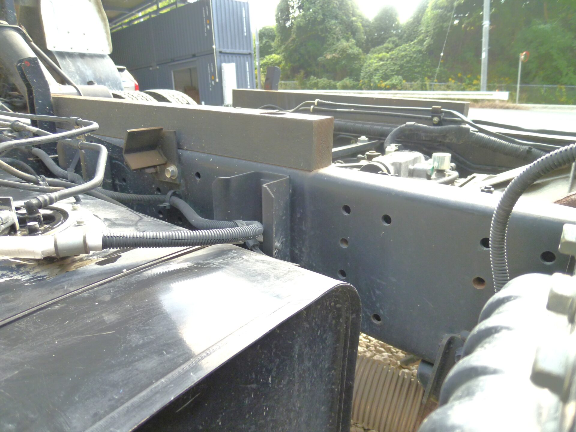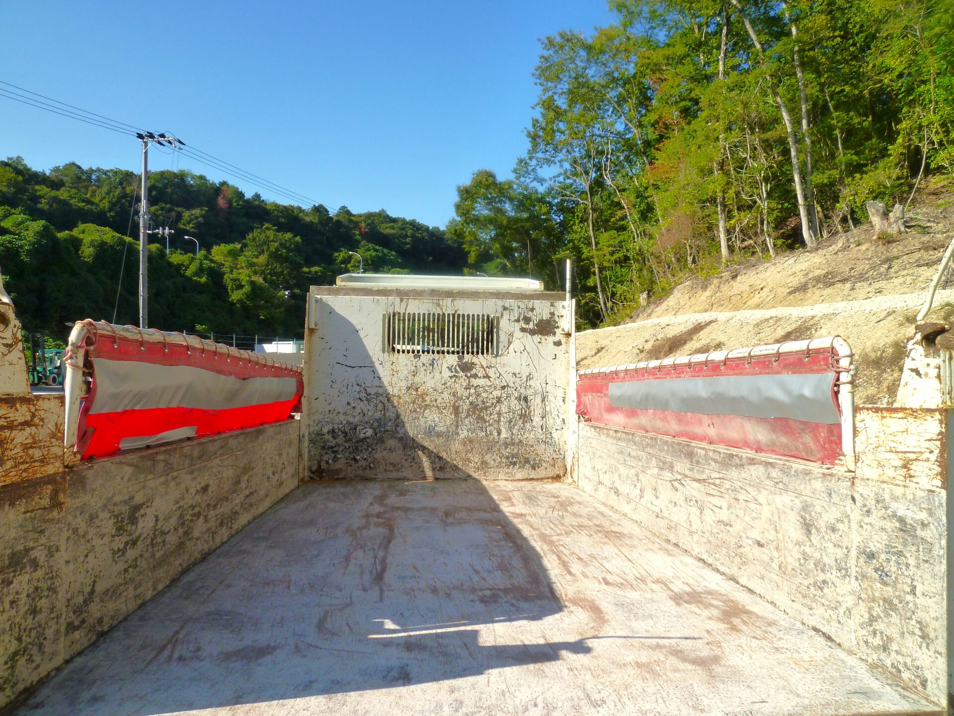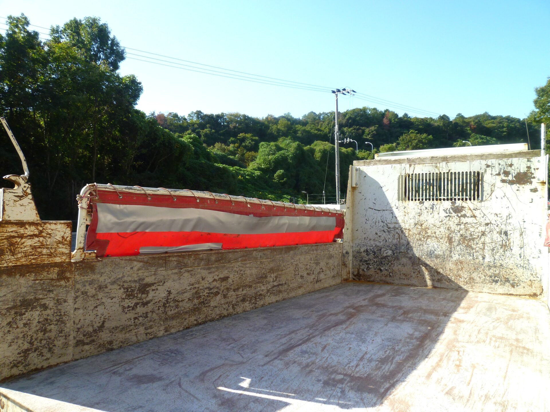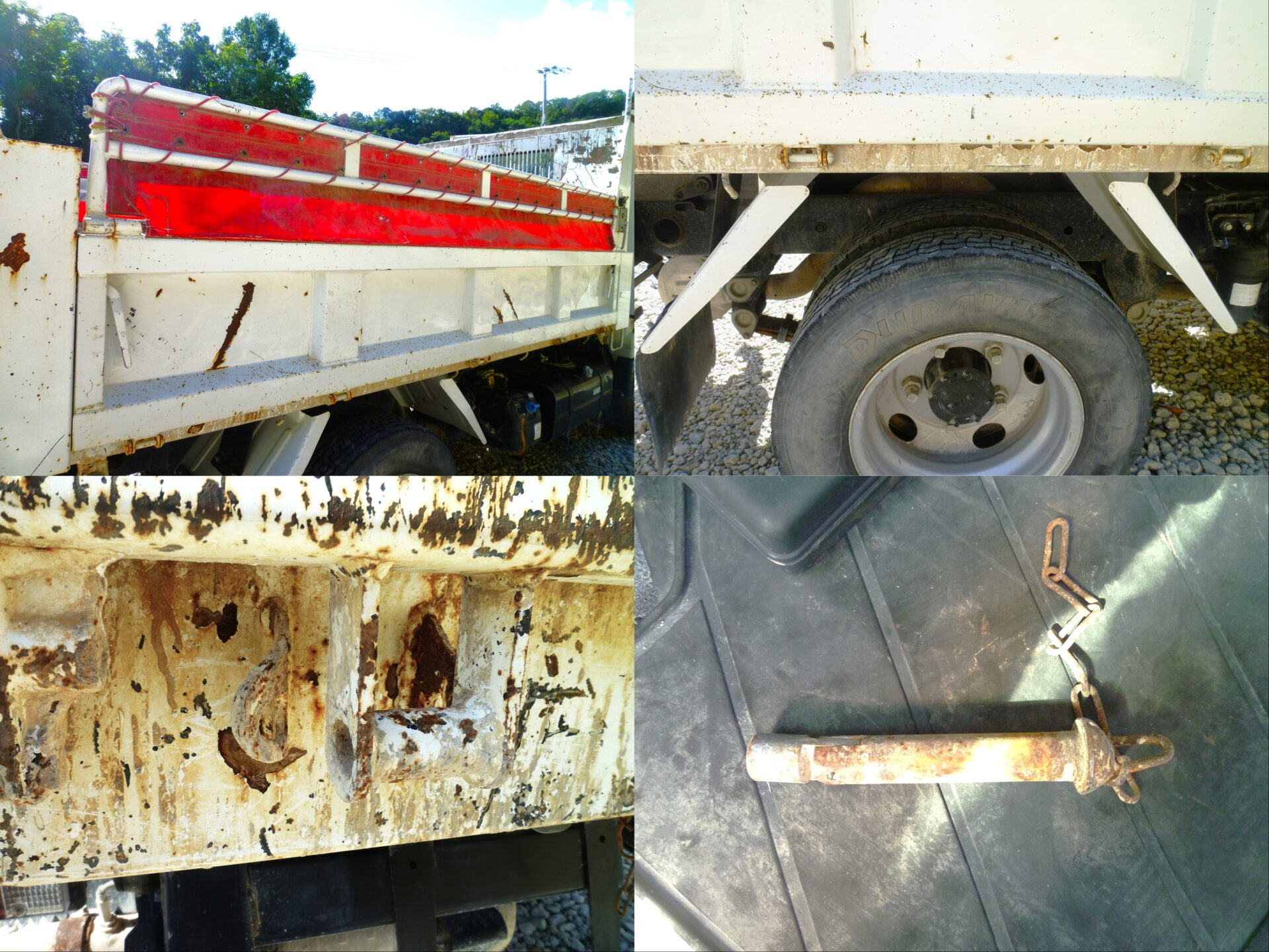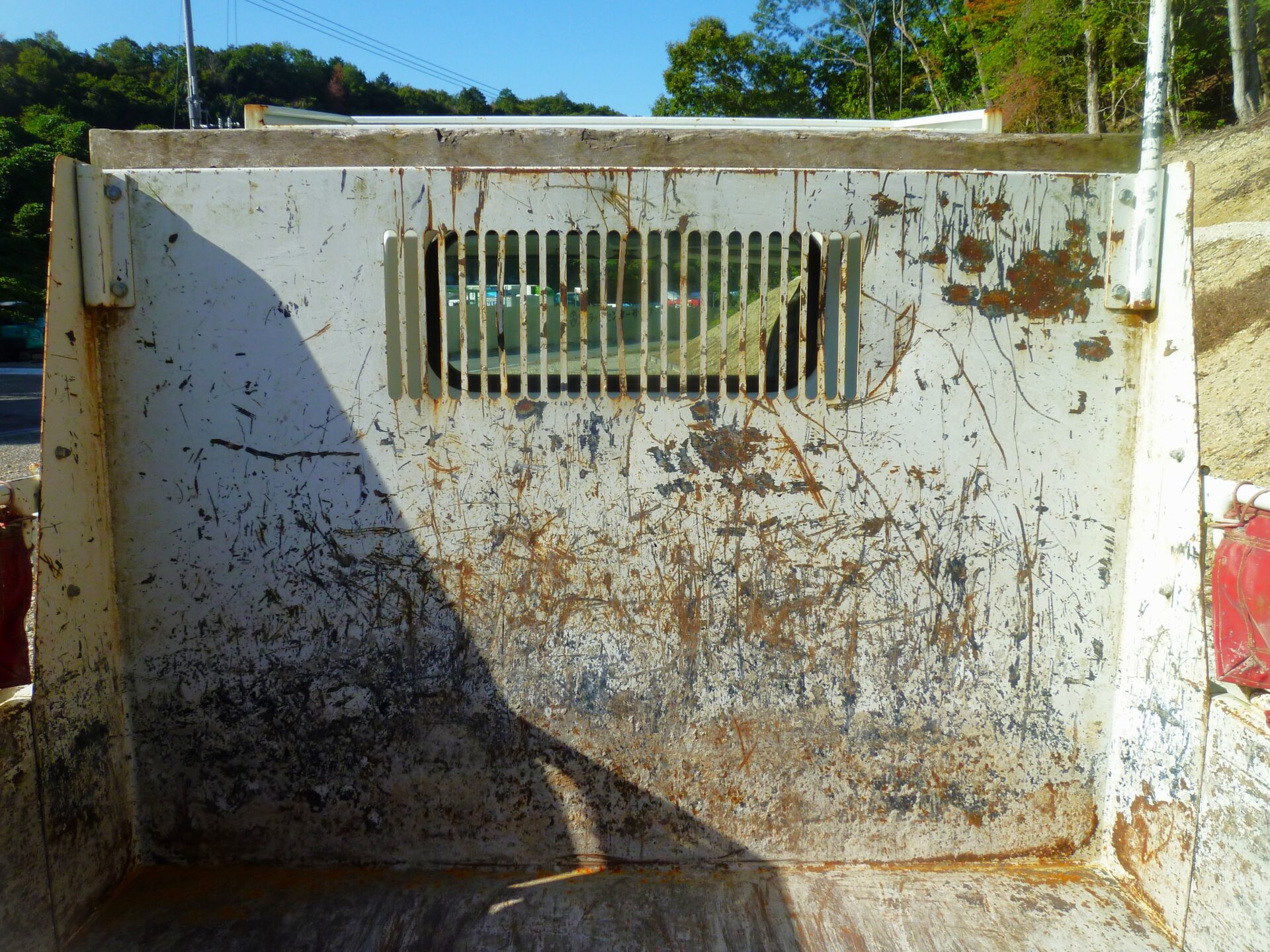 新明和 MODEL/DR2-0110SY MFG.No./S10711007 シートデッキ コボレーン 荷台内外/凹み・スリキズ・サビ多数 看板跡 コボレーン補修 荷台・足回り/セメント付着 後煽り安全ピン無し