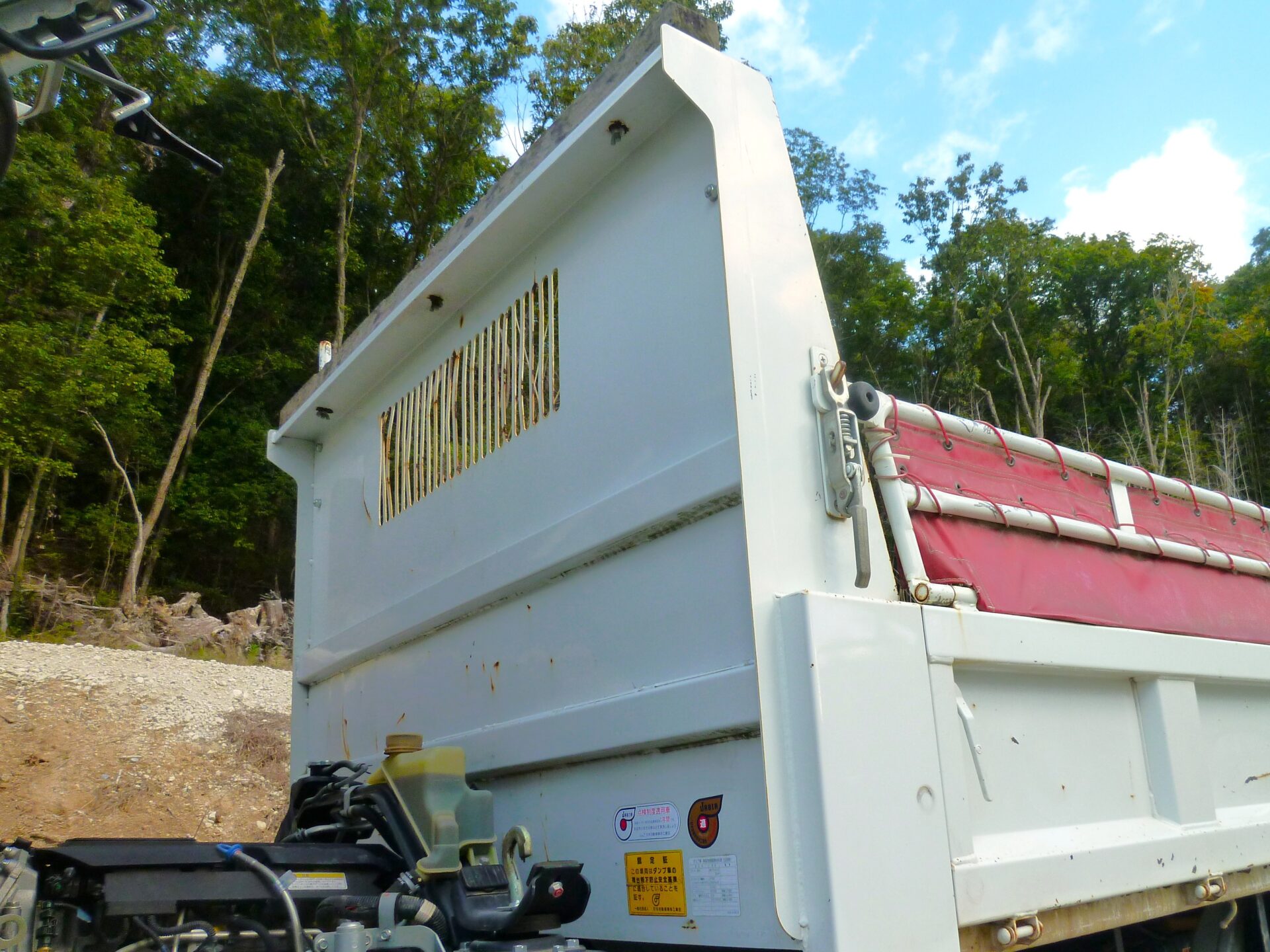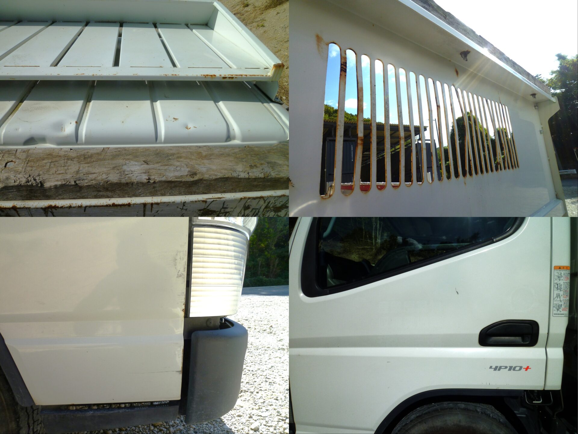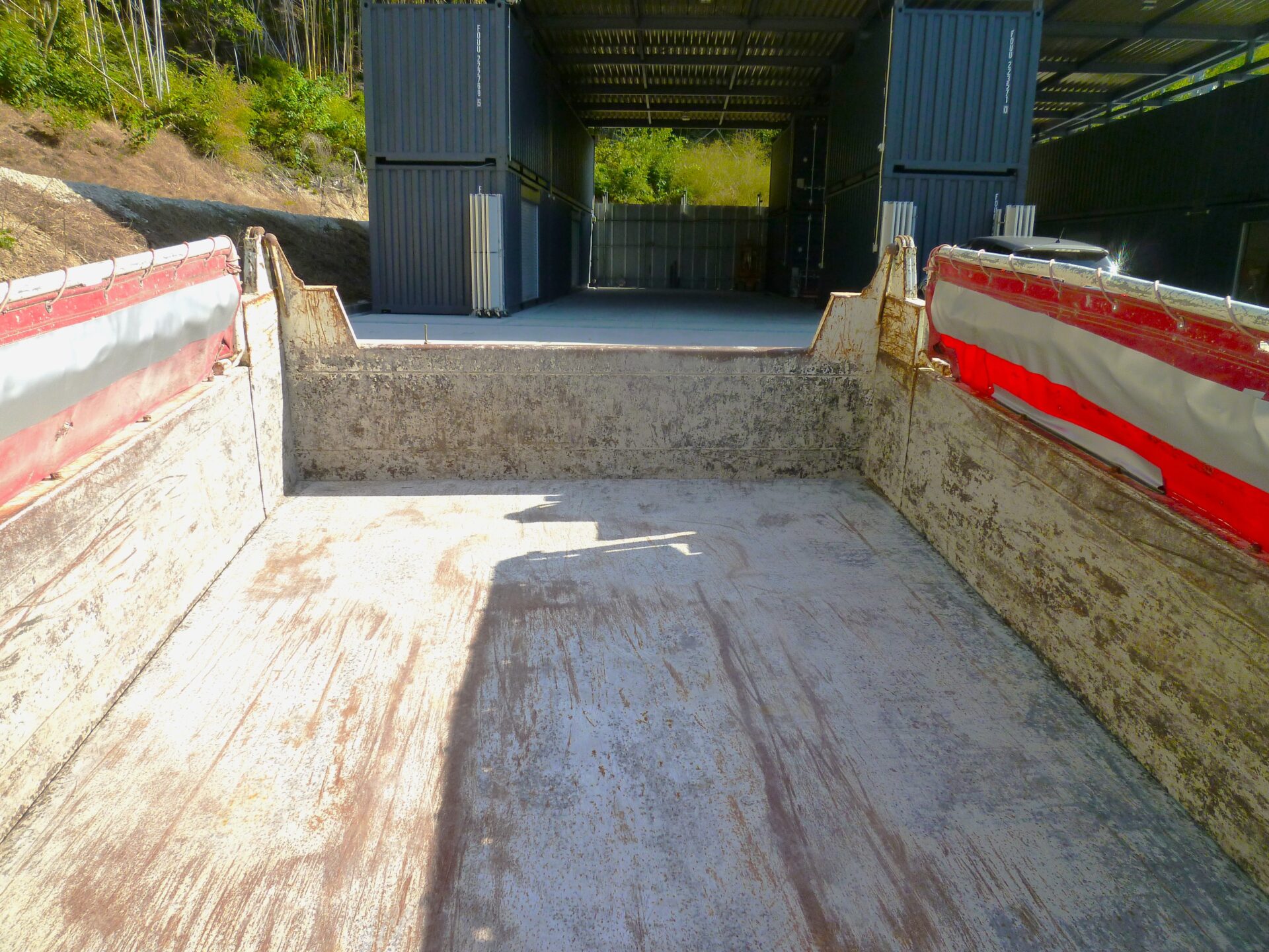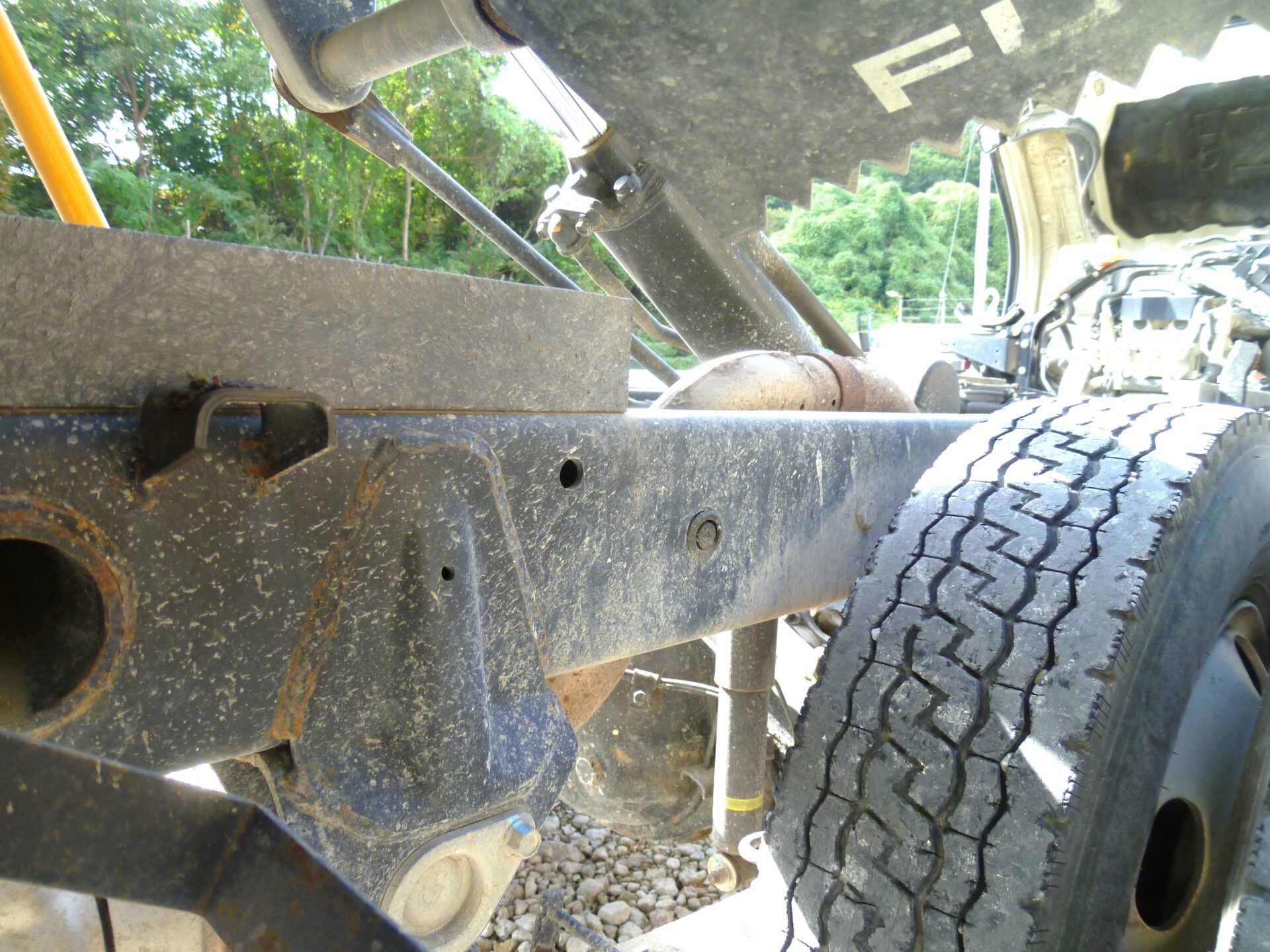 新明和 MODEL/DR2-0110SY MFG.No./S10711007 シートデッキ コボレーン 荷台内外/凹み・スリキズ・サビ多数 看板跡 コボレーン補修 荷台・足回り/セメント付着 後煽り安全ピン無し