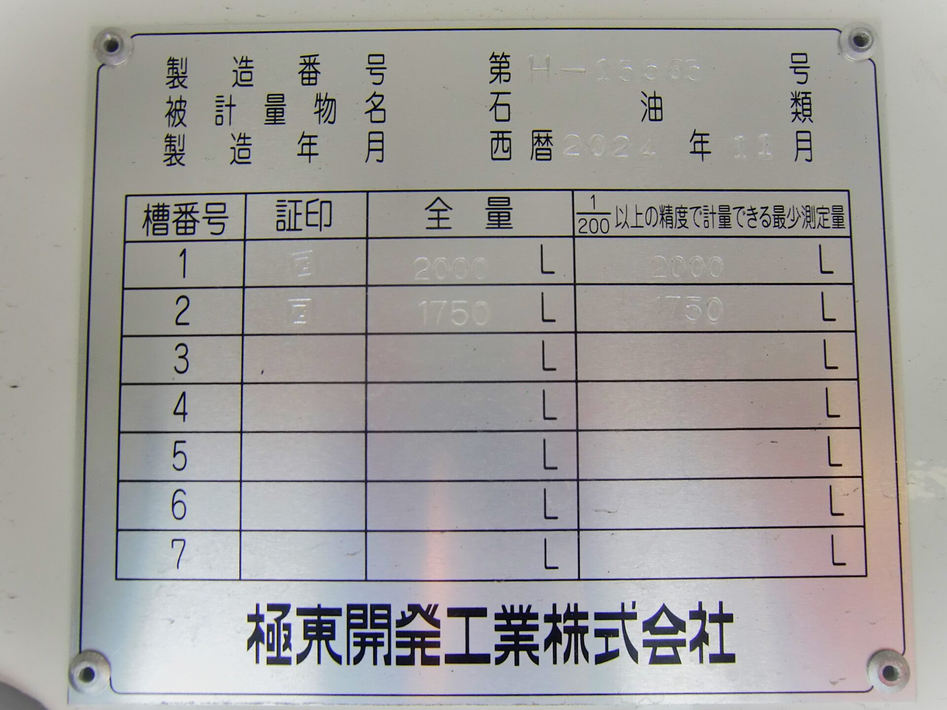 極東開発 型式/LS04-10 製造番号/23L010001N 3.75KL 2室 流量計/トキコ タンク検査証 70kpa 検査番号/15629 検査年月日/R6.10.7 積載物/灯油・軽油・重油 未使用車