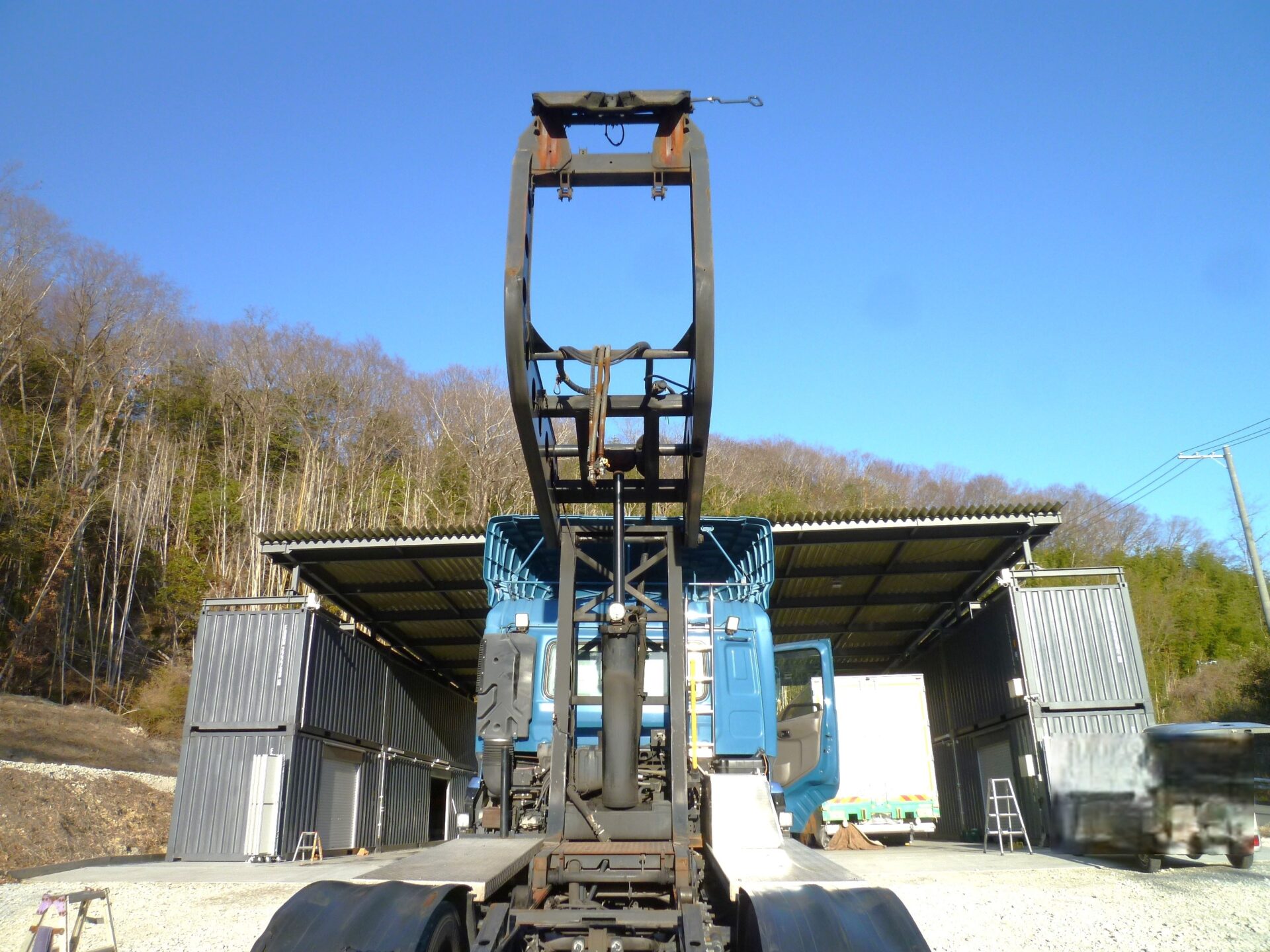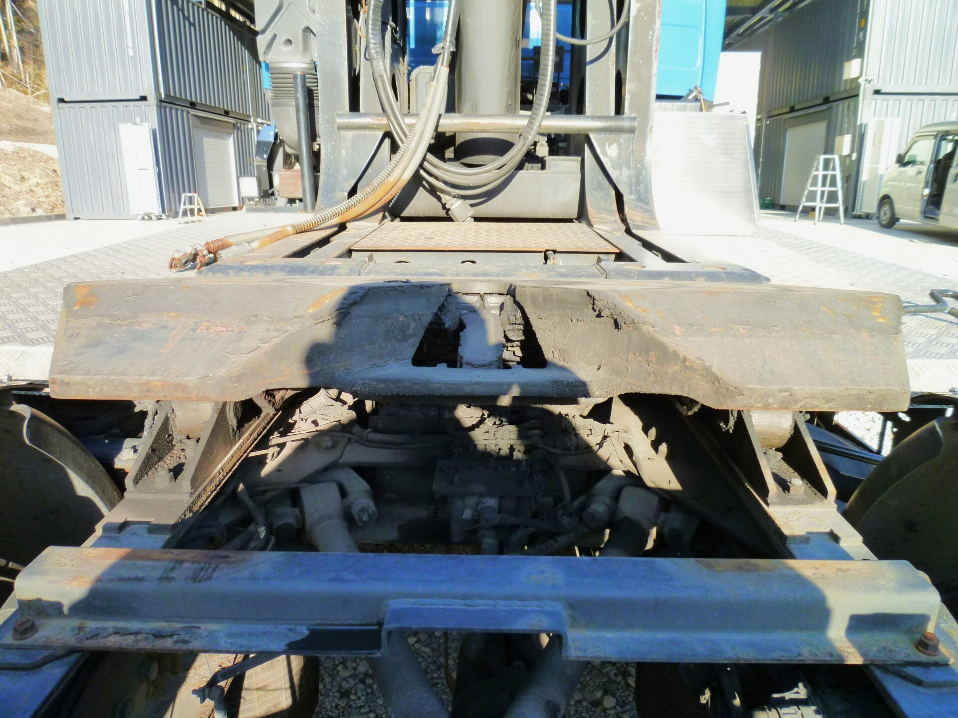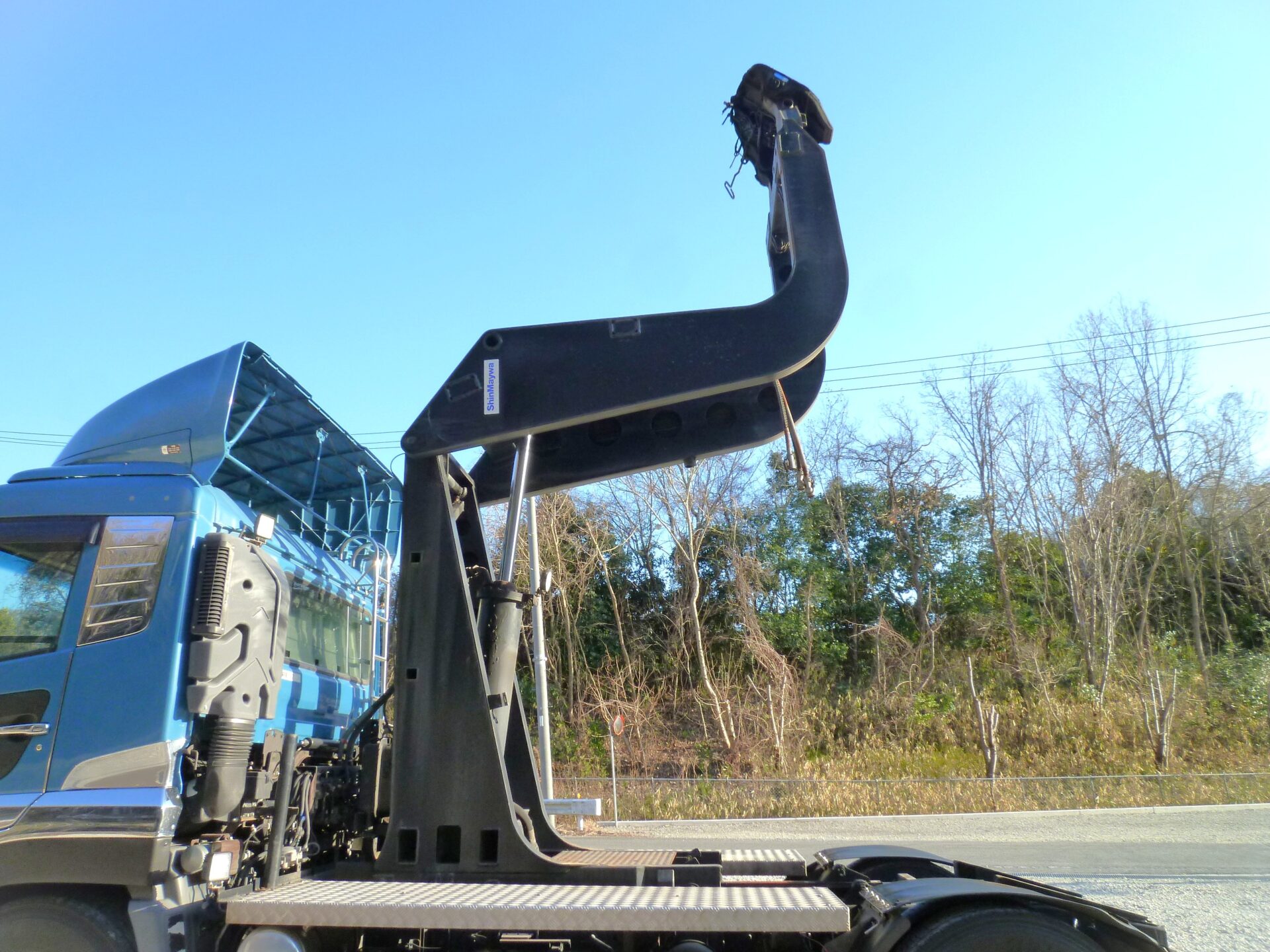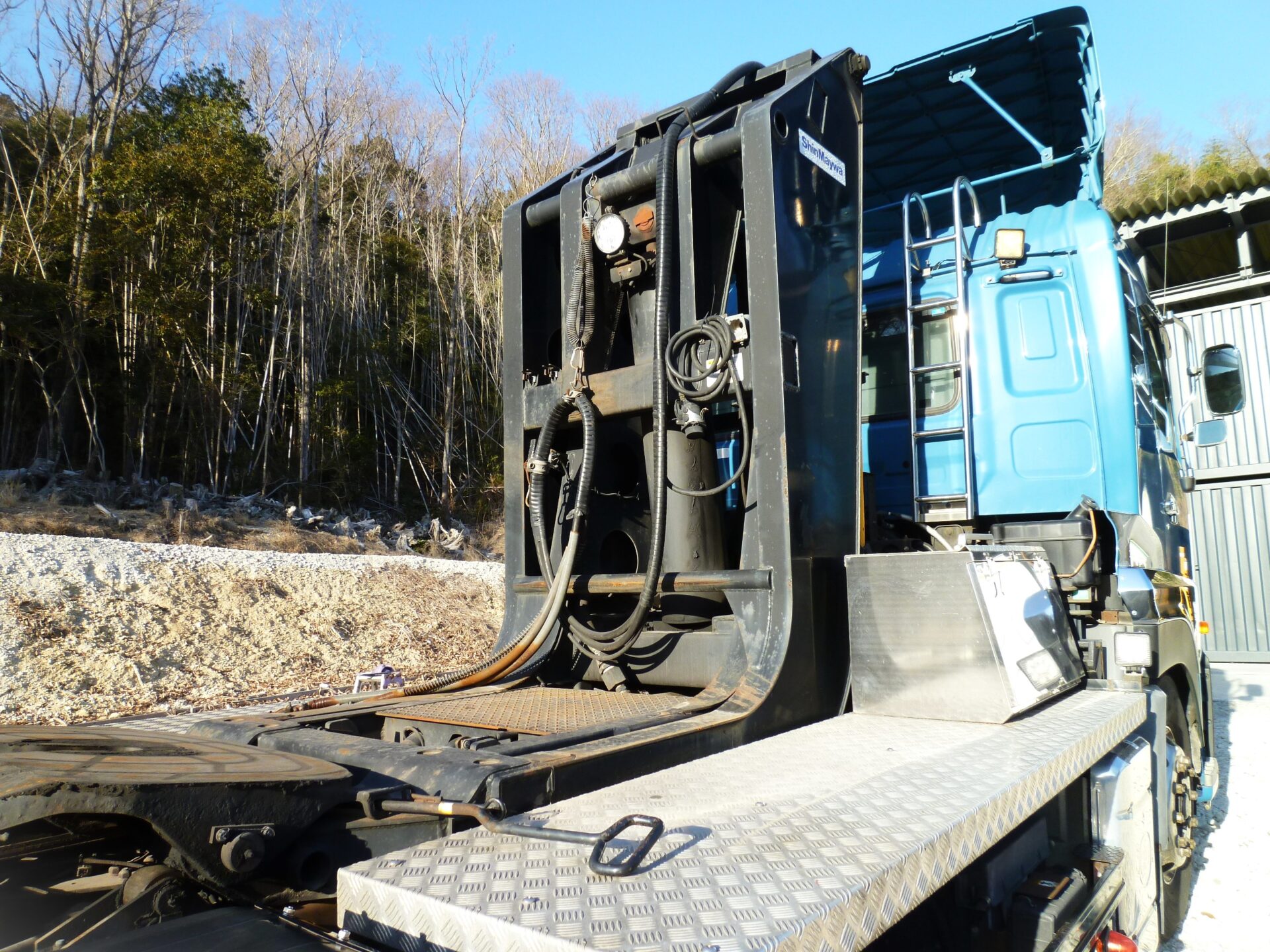 ハイリフト 新明和/TRH85-60K MFGNo.F411427649 最大角度37° カプラ/ソーシン 型式/R-12 第五輪荷重/12,000kg 製造番号/D4-1754 リヤエアサス アルミホイール メッキパーツ 工具箱1コ ハイリフト部/サビあり